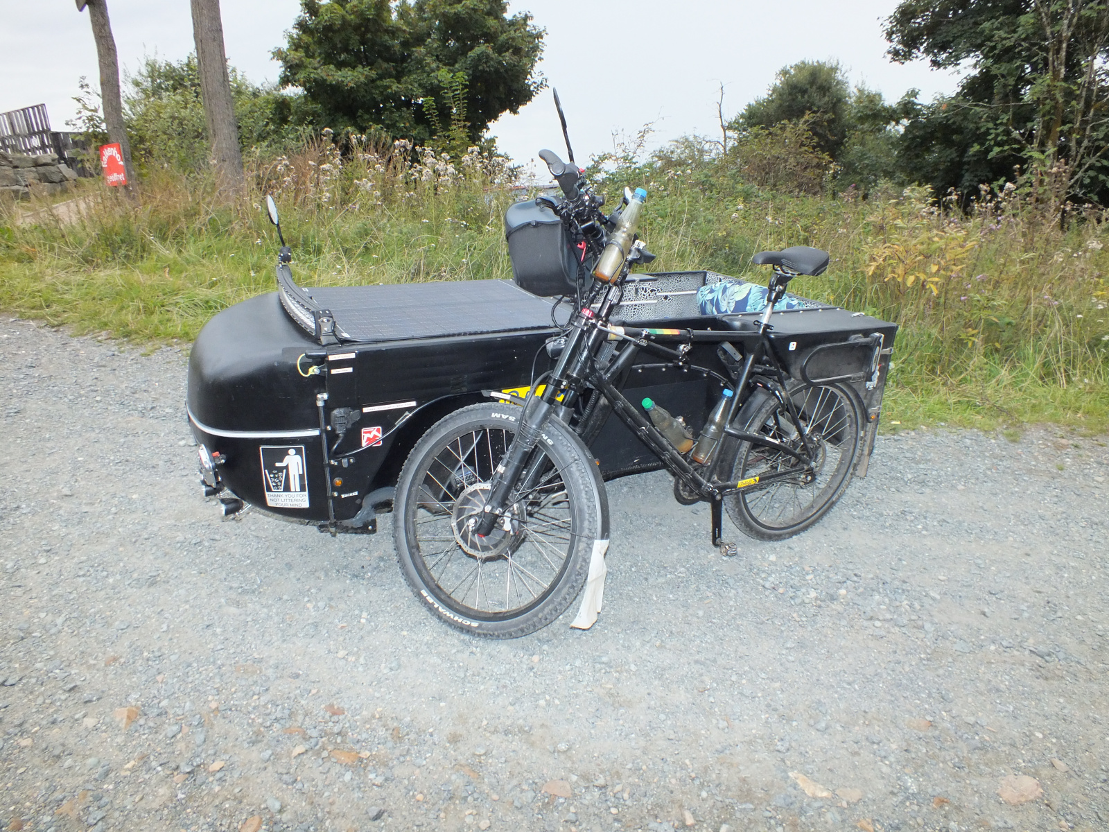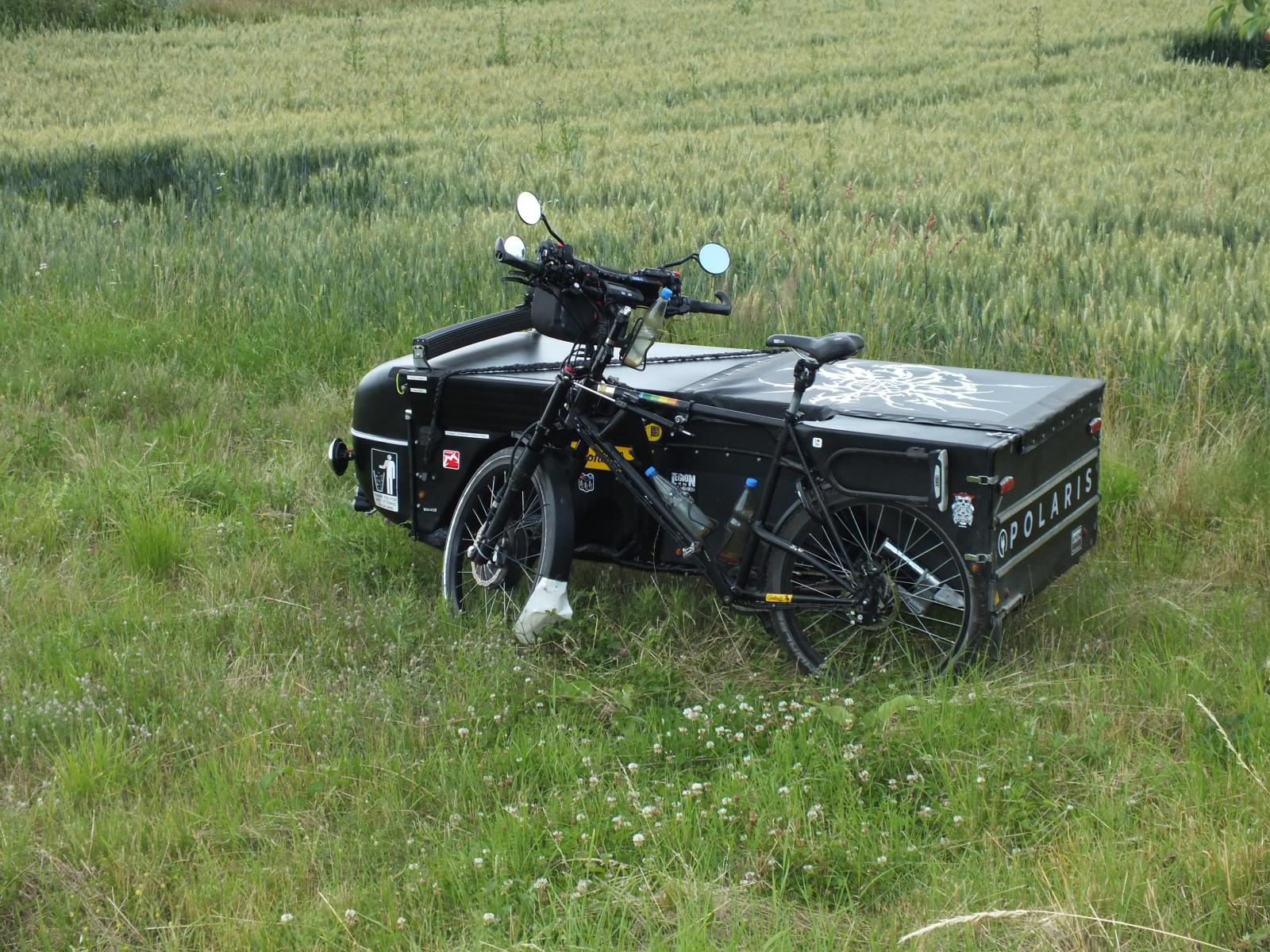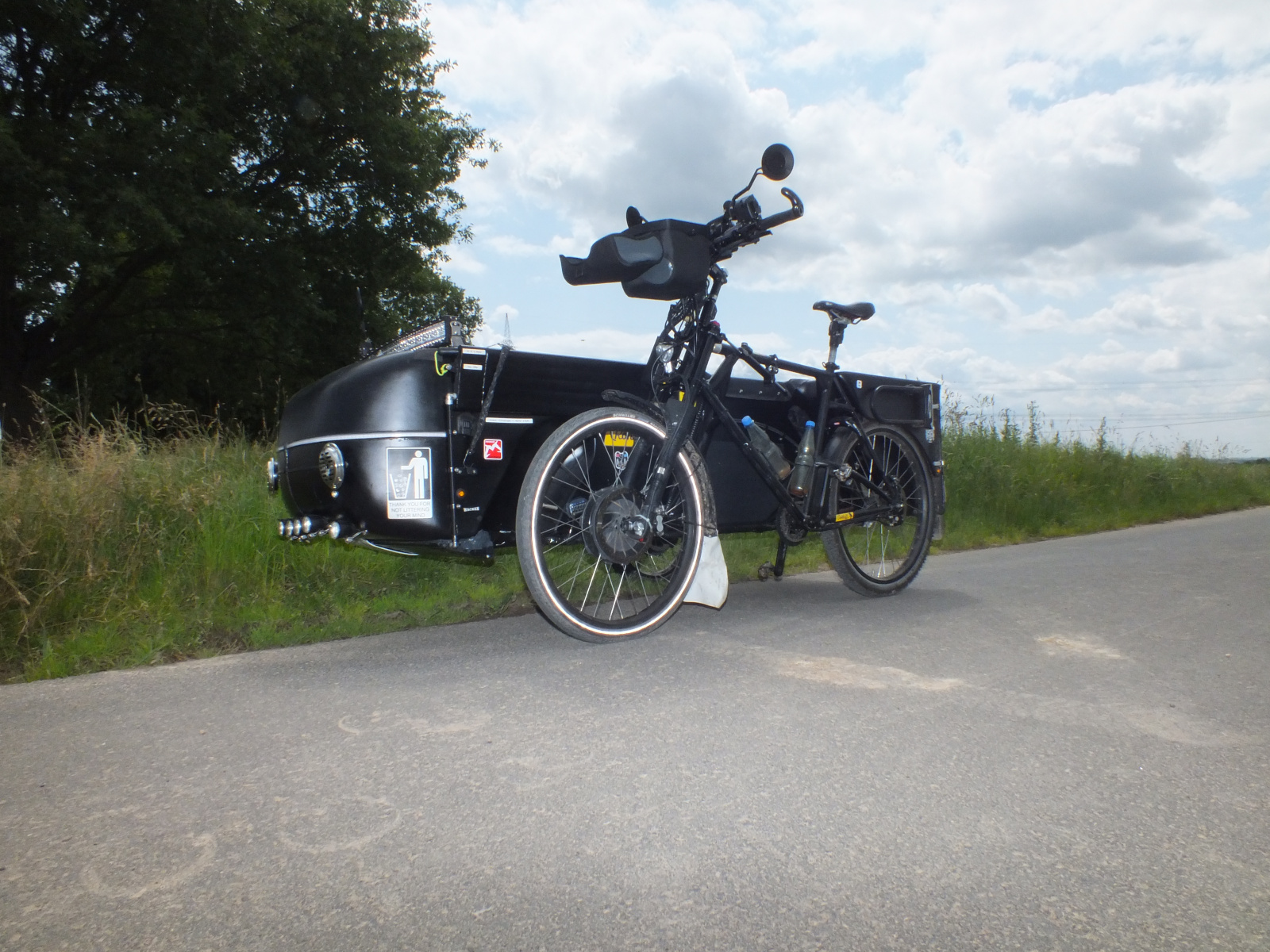Das Fahrrad habe ich mir selbst gebaut da es noch kein Fahrradgespann in dieser größe gibt um viele schwere Lasten zu transportieren.