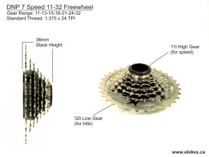 We still stock an assortment of 7,8 and 9 speed threaded freewheels with an 11 tooth smallest cog for people with 3rd party hub motors. Almost all standard threaded freewheels max out at a 14 tooth small cog, making it difficult to keep up with pedaling at faster ebike speeds. If you have a bike with a 7 speed freewheel and want to upgrade to a 8 or 9 speed, you will also need spacer washers on the end of the axle. The 8 and 9 speed freewheels will almost always extend past the axle shoulder on a hub motor. We carry 3mm or 5mm spacer washers.Â
