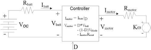 - Controlleris assumed to be a single quadrant (non-regen) controller, with the indicated input and output equations.